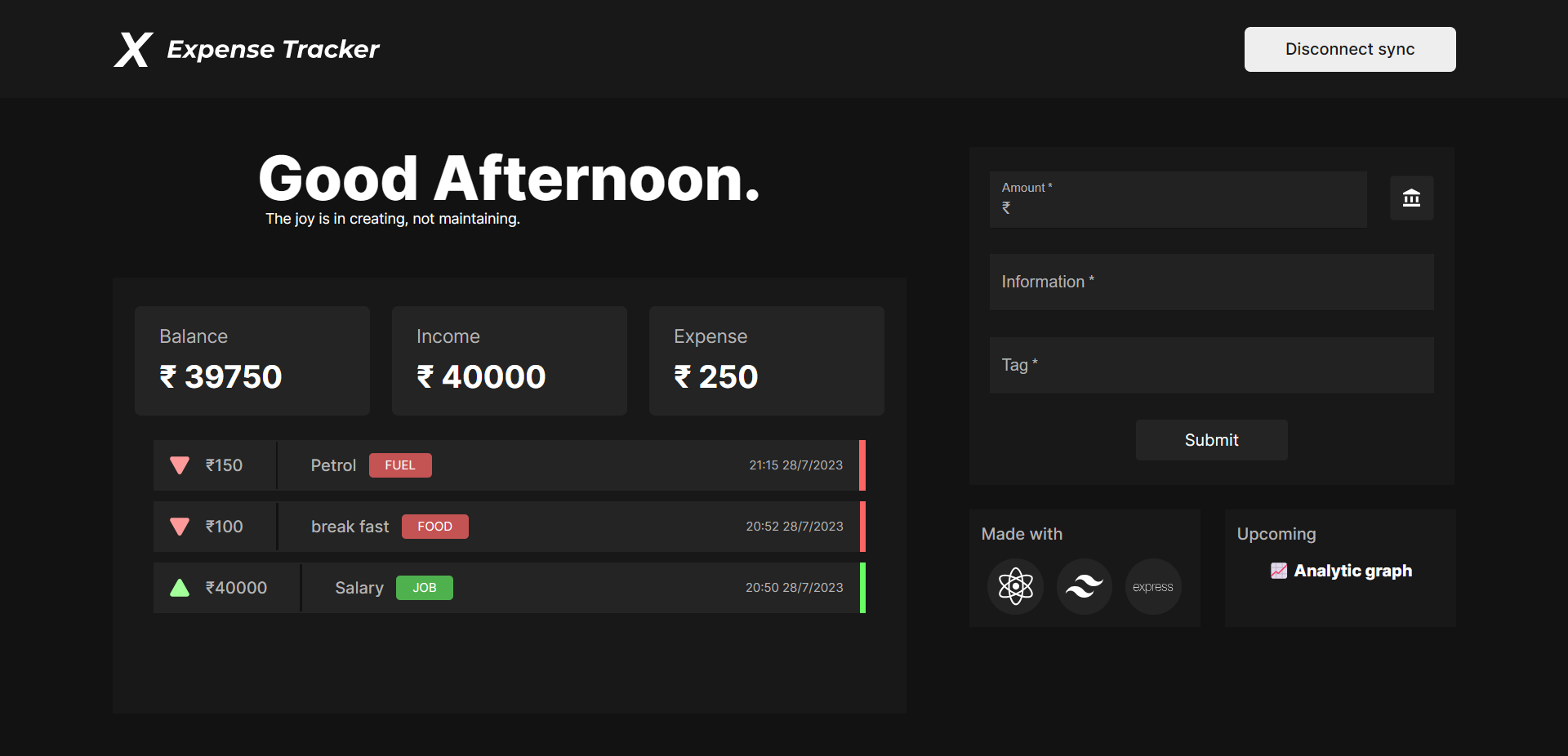 Expense Tracker is a web application that allows you to track your expenses in a simple and easy-to-use way. The application is built using React and Express.js, which are two of the most popular JavaScript frameworks. This makes the application fast, reliable, and scalable