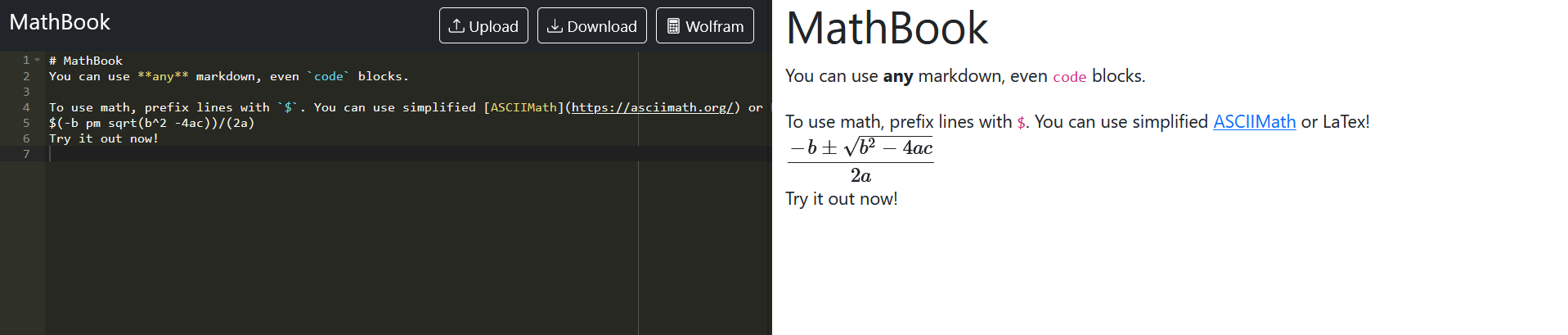 mathbook fancy math editor based on glued-together open source libraries features live markdown rendering ASCIIMath for easy math input per line LaTeX support markdown up/download wolfram alpha shortcut screenshots OSS libraries ACE Editor MathJax ASCIIMath Bootstrap